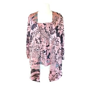ALEX EVENINGS Womens Pink Black Floral Jacquard Top Sheer Cardigan Set Size L