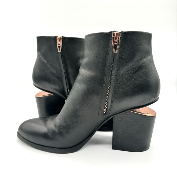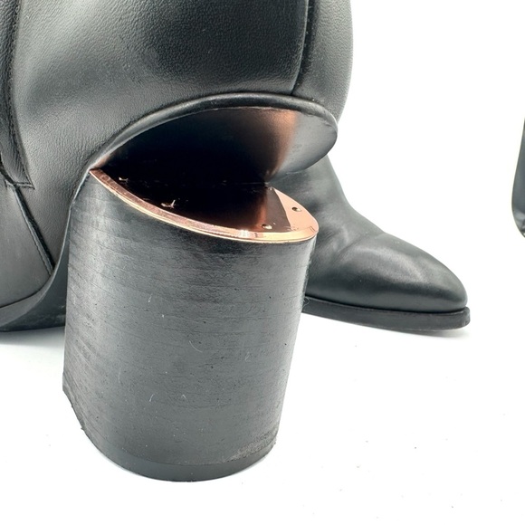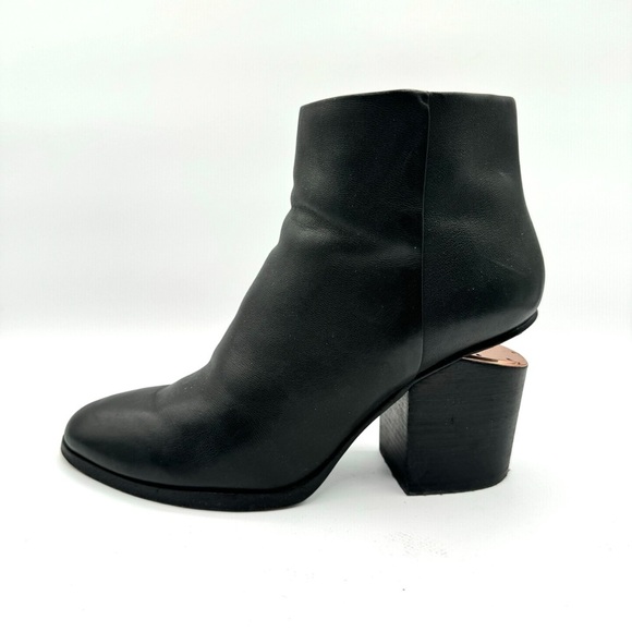 Meta Keywords: Alexander Wang block heel boots, size 39.5, leather zip-up boots, stylish block heels, copper-accented boots, luxury leather boots, side zip boots, black leather boots, women’s fashion boots, winter boots, spring boots, fall boots, chunky heels.