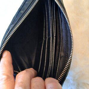 This AW wallet is black lambskin. It is in very good condition, outside of wear on the outside corners of the bottom and top corners (see the last two pictures). They are not very noticeable. Pricing reflects these slight flaws. There are two exterior zip pockets. The interior is in very good condition, showing no wear or stains. There are a total of 12 card pockets with 3 larger open storage pockets.