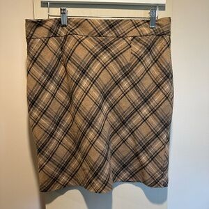 This ALFRED SUNG tartan skirt features a sleek pencil style in a versatile tan color, perfect for a professional work setting. The knee-length design offers a tailored fit, while the smooth waistband ensures a polished look. Crafted from a medium-weight fabric, it maintains its structured shape, making it a timeless addition to any wardrobe.