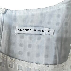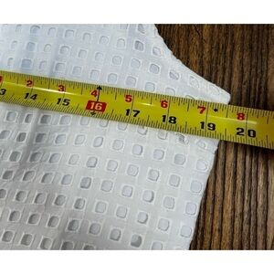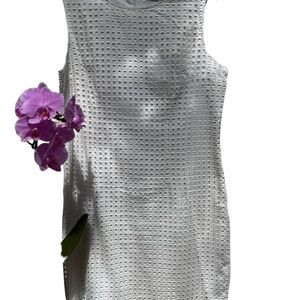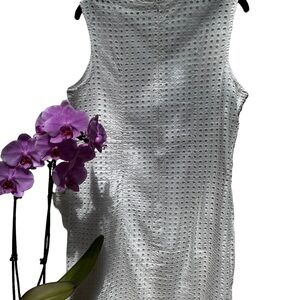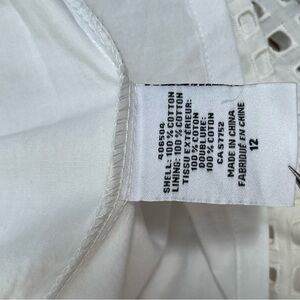 In excellent pre-owned condition, only worn once, white, lined, cutout pattern shift dress. Very attractive on and can be worn with many colours of jackets, sweaters and jewelry. Size 12, see measurements.