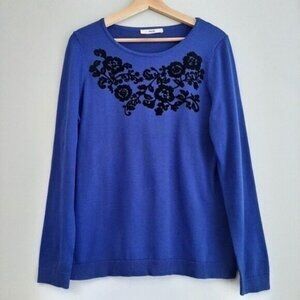 • Long sleeve fine knit pullover top in bright cobalt blue with front velvet flower pattern in black.