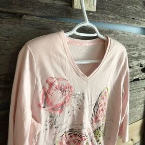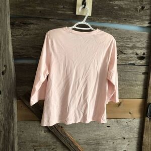 Pale pink, 3/4 length sleeve, v-neck top with butterfly detail