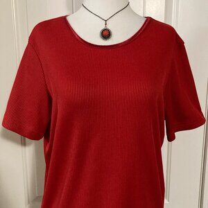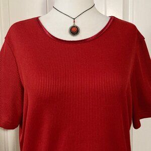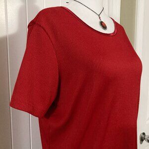 ALIA Red ribbed short-sleeve top with satin trim neckline ~ LARGE XL shirt tee