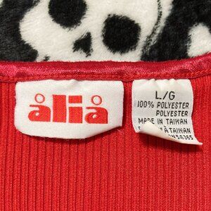Hailing from the brand Alia and dating to c. 1990s - 2000s, this lovely deep red shirt is well-made, wonderfully stretchy, and comprised of 100% (relatively lightweight) polyester.