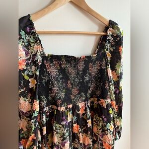 Romantic floral minidress with flattering smocking at bodice creating a gathered waist, featuring puff-style sleeves and smocked cuffs.