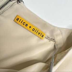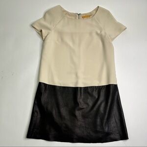 Alice + Olivia cream and black colorblock shift dress. The perfect 60s style of colorblocking. The cream portion is a polyester fabric and the black bottom half of the dress is 100% lamb leather and is extremely soft to the touch. Fully lined inside. Exposed silver zipper up the back that is trimmed with the leather. The most beautiful detail. Such a gorgeous well constructed dress. In excellent used condition with the only flaws being two areas where there are two very light and thin runs in the fabric (very hard to notice in person). Please see photos and video for measurements and details. Women's size 10.