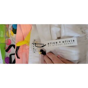 ALICE + OLIVIA DISTRESSED WHITE STRETCHY JEANS. ALICE + OLIVIA DISTRESSED WHITE STRETCHY JEANSWhite Distressed Alice + Olivia JeansSize: 24Waist: 24"Hips: 27"Thigh: 14"Length: 39"Front 8.5"Skinny Leg JeansApprox. Retail $350