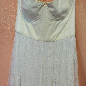 ALICE & OLIVIA white lace fully lined maxi dress. Top I believe may be leather or could be fake leather. I'm not sure. It is soft. Bustier with cups. Strapless. This dress is really pretty. So feminine. Lovely dress measurements in photos.