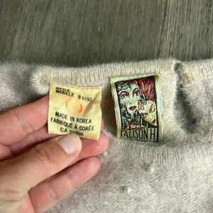 This top is absolutely stunning. Made of angora rabbit hair blend and has shoulder pads. Perfect for any occasions.