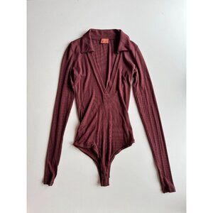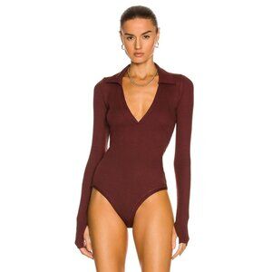 ALIX NYC Monterey Clove Brown Ribbed Jersey V-Neck Polo Thong Bodysuit, Size XS