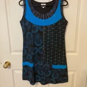 sleeveless knee length sundress made of jersey cotton - black with turquoise, yellow and red highlights