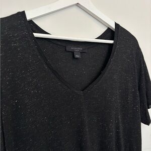 Stylish tee with subtle speckled design, has some shine like glitter flakes. Short sleeves and V-neck for a modern look. Ideal for casual wear.