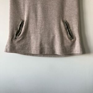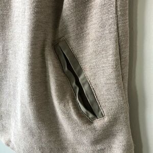 All Saints cotton top with suede leather accented panel and pocket trim. More textured than a T-shirt, lighter than a sweater.