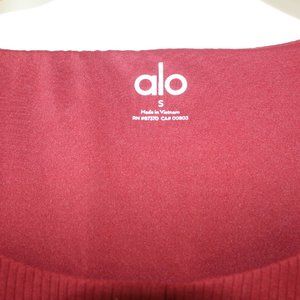 Gently worn. In excellent condition. Alo Yoga. Small. Built-in bra with removable cups. Cranberry red. Made from a blend of polyester, tencel, and spandex. Stretchy. Rib knit pattern.