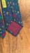 Alynn Neckwear 100% silk neck tie. "Foreign Exchange" theme. Blue background with green, yellow, white and pink symbols of different currencies. Made in USA.