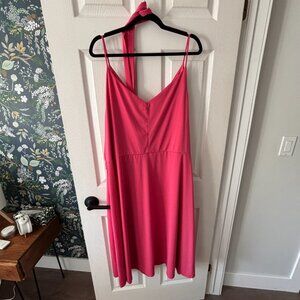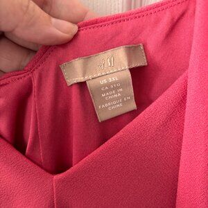 Bubblegum pin k A-line midi length spaghetti strap dress with waist tie from H&M. Super cute dress that can be worn with a white shirt underneath for a 90's vibe. Sizing is generous in the hips and fitted through the bust. There is a little stretch in the fabric, but not a lot.