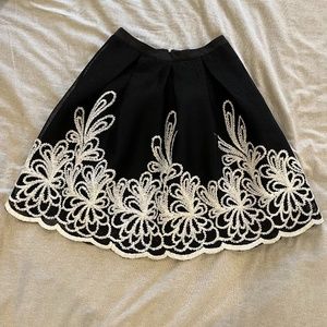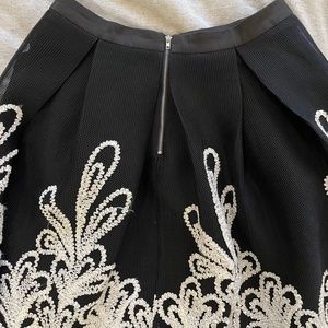 Black & White A-Line Midi Skirt, brand is "Chelsea" bought from the store Honey. Worn once to a wedding. Has a bit of volume and falls nicely with good structure. Has a few little pulls in the white accent stitching (is the nature of the material), but nothing serious/noticeable, can be easily snipped. Doesn't have a listed size but fits like a small/medium (measurements in photos).