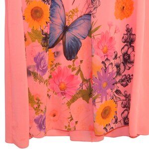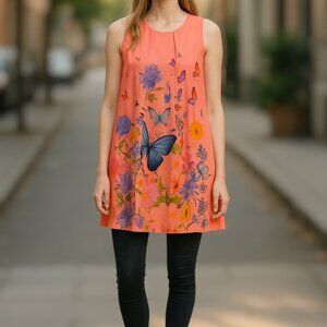 Details: This listing is for a pre-loved Light Pink-ish Coral light polyester blend lined A-Line Midi Tunic Dress with a beautiful floral and butterfly print in a size Medium, that would best compliment a woman between 5’ 2’ to 5’ 5” as it will sit just below the knee or if you are over 5’ 7” and taller this is best worn over a bodysuit or dress and will fit more like a beautiful tunic; great to wear to a summer wedding, a date, cruise/tropical vacation.