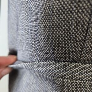 Beautiful lightweight blazer made from a polyester/linen blend. 3/4 Ruched sleeves. One front hook and clasp closure. Fully lined in a silky black. Pockets are still sewn from purchase.