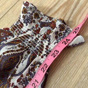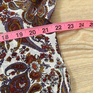 AMANDA GREEN * Elegant Lightweight top with ruffles around neck and wrists Sz M* Paisley *White-purple-red-orange-blue*This top is a must-have for any wardrobe and offers a sophisticated look. Perfect for Spring and Summer and the cooler days . Can be styled easily with pants, jeans or skirts and make a lasting impression. Endless options. Elevate your Style with this Chic wardrobe essential * * Dressy * Office * Elegant * Casual* Business Casual * Preppy* feminine * Floral * Paisley measurements in Photos