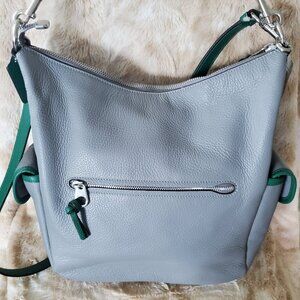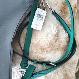 This is the Pennie Shoulder Bag, style C563754, in the Silver Granite Multi color palette. Beautiful grey purse body with a stunning green strap and trim, with silver tone hardware and trim. This beauty comes with its detachable and adjustable leather crossbody strap. Retails for $450 US/Cdn.