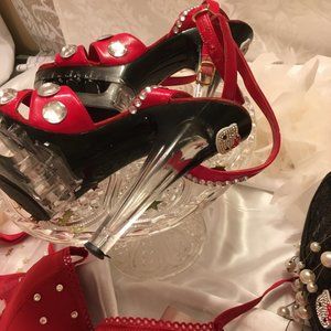 AMAZING vinatge cherry red glass platforms with hell kitty crystal details!