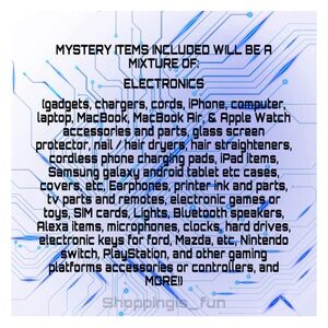 MYSTERY ITEMS INCLUDED WILL BE A MIXTURE OF: 🔻 ELECTRONICS and MORE(clothing, gadgets, home, outdoors, etc!)🔻 (chargers, cords, iPhone, computer, laptop, MacBook, MacBook Air, & Apple Watch accessories and parts, screen protector, cordless phone charging pads, iPad items, Samsung galaxy android tablet etc cases, covers, etc, Earphones, printer ink and parts, tv parts and remotes, electronic games or toys, Lights, Bluetooth speakers, Alexa items, microphones, clocks, hard drives, Nintendo switch, PlayStation, and other gaming platforms accessories or controllers, and MORE!)