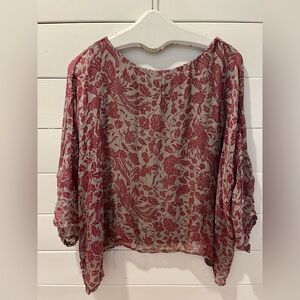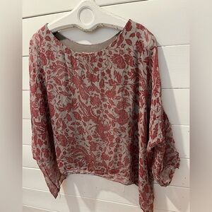 Light and elegant, this Italian-made blouse by Ambra features a delicate floral and bird print in red on a taupe-grey background. Made of 100% silk with a soft inner lining in viscose and a touch of elastane. Relaxed, slightly boxy fit with 3/4 sleeves and elastic cuffs. Refined and feminine. Size S.