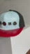Very pale blue in front, black all around with a red visor. Inside is lined in the front to cover button backs and rim is lined and padded for comfort. Unisex.