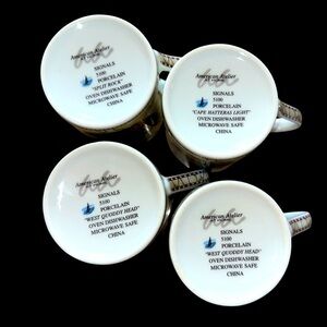 Set of three unique lighthouse-themed mugs. Set comes with an additional repeat-patterned mug, making four mugs in this grouping. Three mugs feature individual designs in vibrant colors. The fourth mug is a repeat of the “West Quoddy Head” design. Mugs are in pristine, clean condition with no chips, cracks or signs of use.