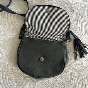 Stylish and functional, this American Eagle crossbody bag is perfect for everyday wear. Made from soft grey faux leather, it features a braided trim along the flap, a playful side tassel, and an adjustable strap for the perfect fit. The magnetic flap closure keeps your items secure, while the roomy interior has space for all your daily essentials. Great for casual outings, travel, or adding a boho-chic touch to any outfit.