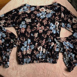 Black bell sleeved top with blue and pink floral details. It has a shirred stretchy waist band and stretchy fabric that makes it super comfortable to wear.