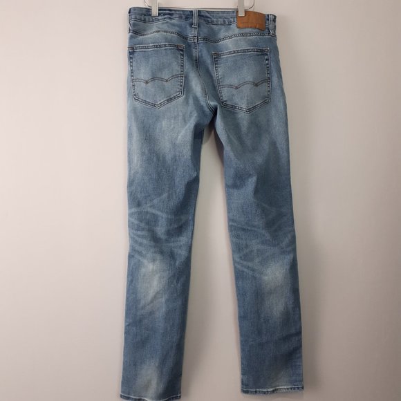 Slim straight style next level airflex American Eagle jeans. In great used condition. Disressing to thighs and knees. Slight distressing to pockets. Size 32 x 34.
