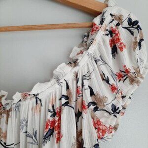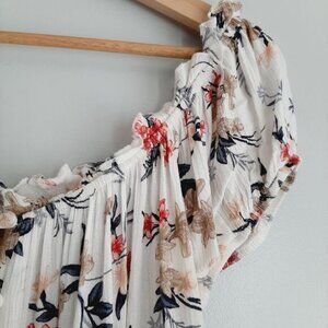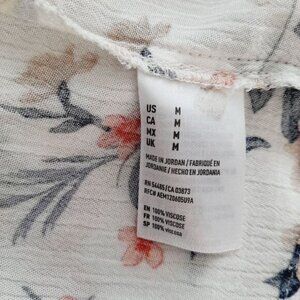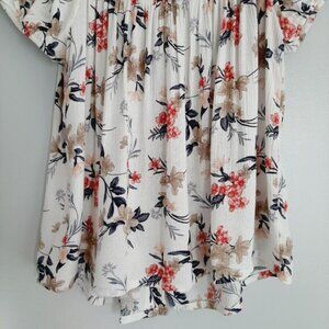 • Fun short sleeve, lightweight summer top in white with all-over grey, tan and red floral botanical pattern.
