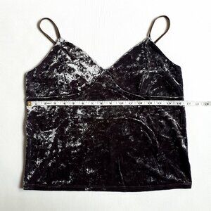 Super soft velvet cami from AE Outfitters in a deep midnight violet colour (almost black). Looks silver when it catches the light. Very stretchy and comfortable box cut fit. Fabric feels cooling to wear. Elastic spaghetti straps and sewn cups without underwire. Cup size is A-B. Perfect for 90's inspired or dark academia looks, or for a touch of femininity under a blazer at the office.