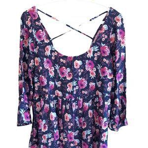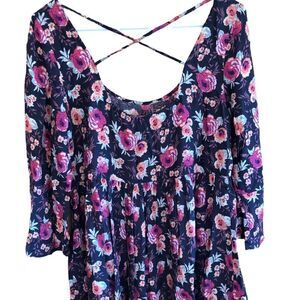 Really cute floral pattern, long sleeve dress with gathered waist and open back. Size medium, rayon, see measurements. Sleeves are 18.5 inches long so 3/4 length. Length 33 inches long.