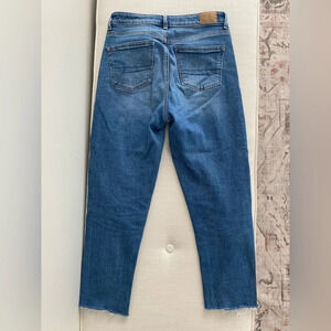 AMERICAN Eagle Short Stretch Mom Jean Medium Blue with raw Hem Size 0