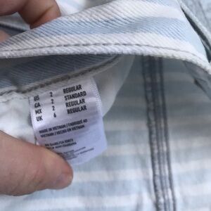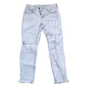 Love, love, love these American Eagle off white and light blue striped jeans. Cute distressed details match perfect with the relaxed Tomgirl fit. Size 2, waist measures about 28”, rise is about 9.5”. Uncuffed inseam is 28”. Button fly closure. So edgy yet so versatile!