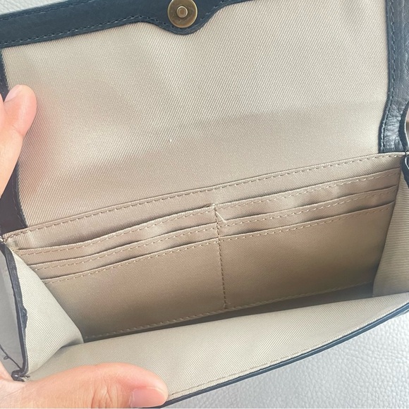 American Leather bag, black leather crossbody, preloved leather bag, adjustable strap crossbody, bronze hardware bag, practical leather bag, card slot crossbody bag.