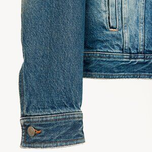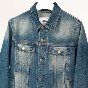Circa 2018, this classic denim jacket from AMI is crafted with a sturdy non-stretch cotton denim in the designer's "Used Blue" wash, and features long sleeves, buttoned cuffs, a collared neckline, front button closures, two buttoned-flap chest pockets, two front welt pockets, buttoned side tabs, and a branded leather patch on the back hem.