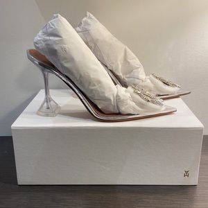 Amina Muaddi reworks its iconic Begum slingback pumps in a transparent finish. Shimmering crystal embellishment, and the label's signature geometrical heel. Let this fashion-forward style bring a high-octane finish to cocktail ensembles.