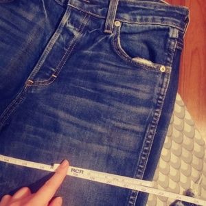 AMO in 'Something Blue' high rise ankle length cropped slim denim. The model photo reflects true color, a rich bright blue with a distressed hem and worn detailing. Only worn once!