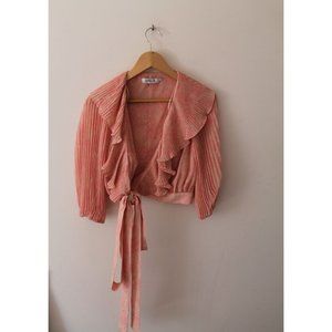 Peach poly chiffon cropped short sleeve wrap top with ruffle neckline.