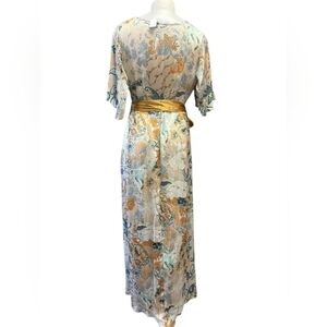 ANANY Faux-Wrap Full-Length Maxi Dress, Peach Green & Gold Floral Paisley Flutter Sleeve Size Small