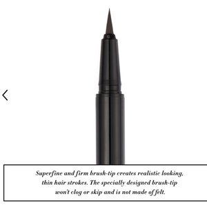 This brow pen is made with compact, smooth brush bristles saturated with enough product that it won't cause skips. Thin, perfect hair strokes. It takes a very light hand to create "flicks" of hair like strokes with minimal focus. If you're totally beginner, it will take a few tries, keep at it bc the finish is beautiful fine fine lines that mimic brow hairs. Awesome if you want that fluffy brow (if your hairs go downwards, remember to use a brow gel to get those brows up and in place like lamination.)