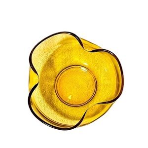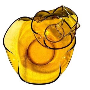 Mid century modern Anchor Hocking amber tri fold dip set. Chip bowl, dip bowl and holder included. In good condition.