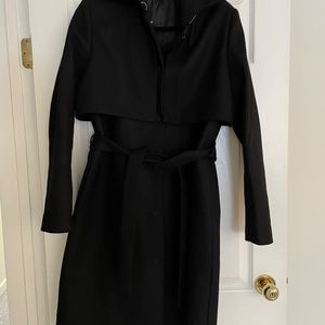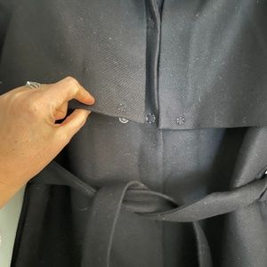 wool coat, trench style with front flaps attached with snaps, tie waist belt, back panel. I am 5 ft 7 and it fits around my calf, very good quality. size uk 12 which would also fit a US 8 or 10. excellent quality and timeless style.