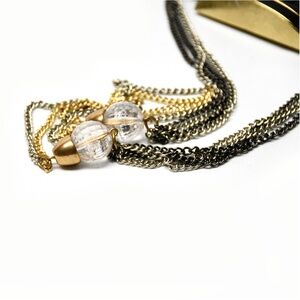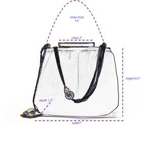 Details: Saffiano cross-hatch textured clasp, Matte finish satin fabric exterior, Shiny satin fabric lining, Multi-chain strap with lucite/plastic faceted bubbles, Gold-tone hardware, 4-strand part of chain strap in silver-tone and anthracite-tone, 2-strand part of chain strap in gold-tone and silver-tone
