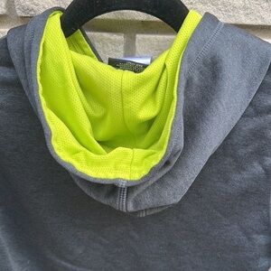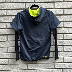 Hooded short sleeve sweatshirt from AND1 brand. Dark grey with lime green accents. Has built in thermal long sleeves to make it look layered without the added bulk. Kangaroo pocket in front. In very good condition, the AND1 screen print on sleeve is peeling a bit but otherwise, no issues.